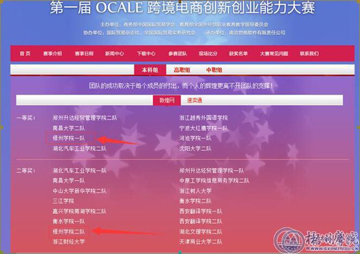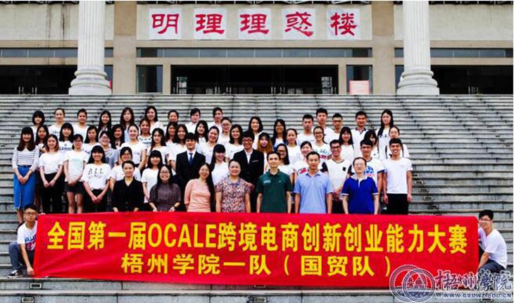 本次全国第一届OCALE跨境电商创新创业能力大赛,由中国国际贸易学会和全外贸职业教育教学指导委员会主办,国际贸易杂志社、全国国际贸易实务研究会协办,南京世格软件有限责任公司承办。整个赛程从2016年3-7月,历时4个月,分为菁英选拔赛、创业排名赛以及全国总决赛三个流程,吸引了包括本科、高职和中职在内共226所学校组队参赛。其中本科组包括广西科技大学、重庆工商大学、南昌大学、沈阳大学等高校在内的88所本科高校。在激烈的竞争中,梧州学院一队参队代表李兴隆、陈雪磊、李文文以团队总分95.12获全国一等奖,梧州学院二队参赛代表顾赛君、朱丽叶、韦小梅以团队总分92.68获全国二等奖。