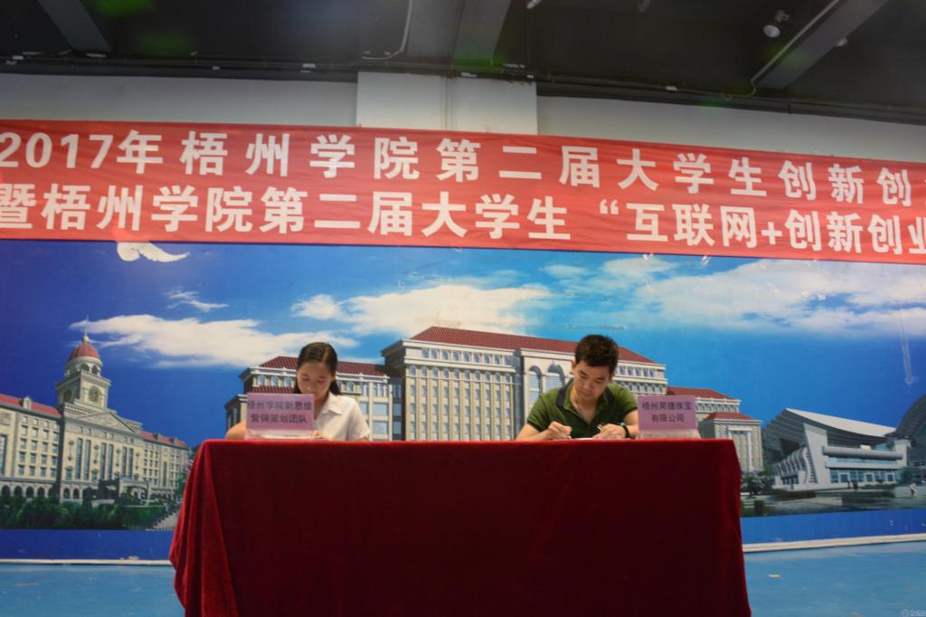 在“梧州学院大学生创新创业成果落地转化”签约仪式上,梧州简捷珠宝有限公司、新思维营销策划团队双方代表当场签约,梧州简捷珠宝有限公司付款5000元购买新思维营销策划团队的创业策划方案。