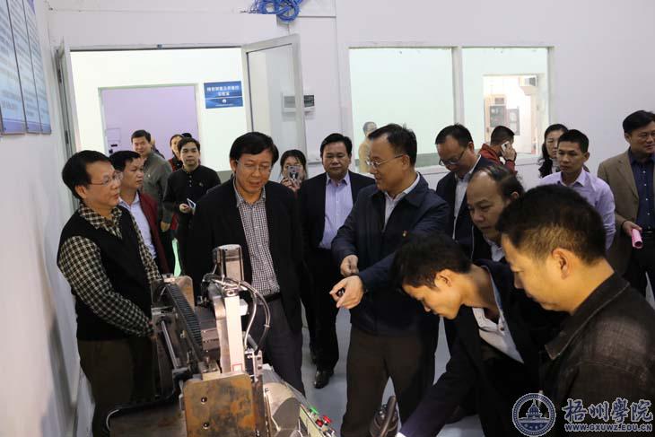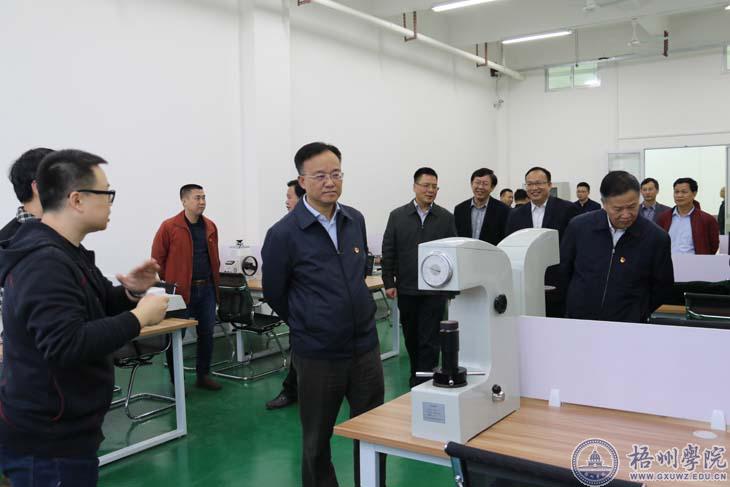 黄俊华一行先后参观考察了基地一楼的精密测量及质量控制实验室、梧州市鸿源机械设备有限公司、模具加工中心、逆向工程与3D打印研究室、新能源汽车研究所项目展、工程材料与力学实验室,还有二楼的广西安壹检测服务有限公司、梧州市金海润文化发展公司(寄生茶馆)。